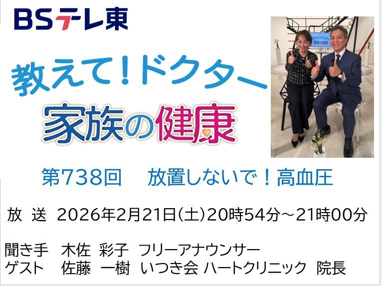 2月21日(土)20時54分からBSテレビ東京「教えてドクター!家族の健康」に院長の佐藤一樹医師が出演します。テーマは「放置しないで!高血圧」です是非ご覧ください。https://www.bs-tvtokyo.co.jp/kazokunokenkou/?_gl=1*1tnb9o7*_ga*MTYxMDQ4MTUzMS4xNzcwNDQwMTI2*_ga_VLBDNDPMWJ*czE3NzE0MTcyODQkbzIkZzEkdDE3NzE0MTc0OTYkajYwJGwwJGgw